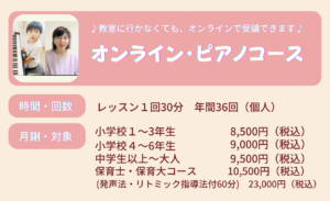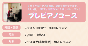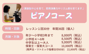 体験レッスン料金はピアノコース4,000円、リトミックコース3,000円です。